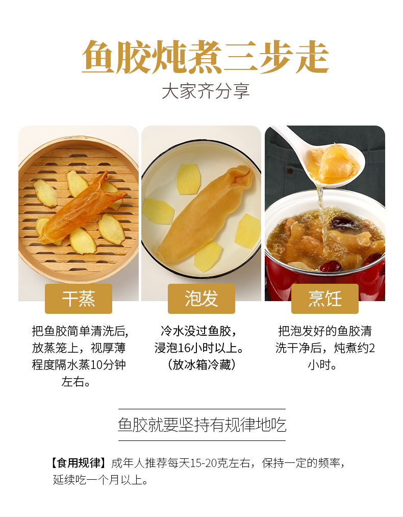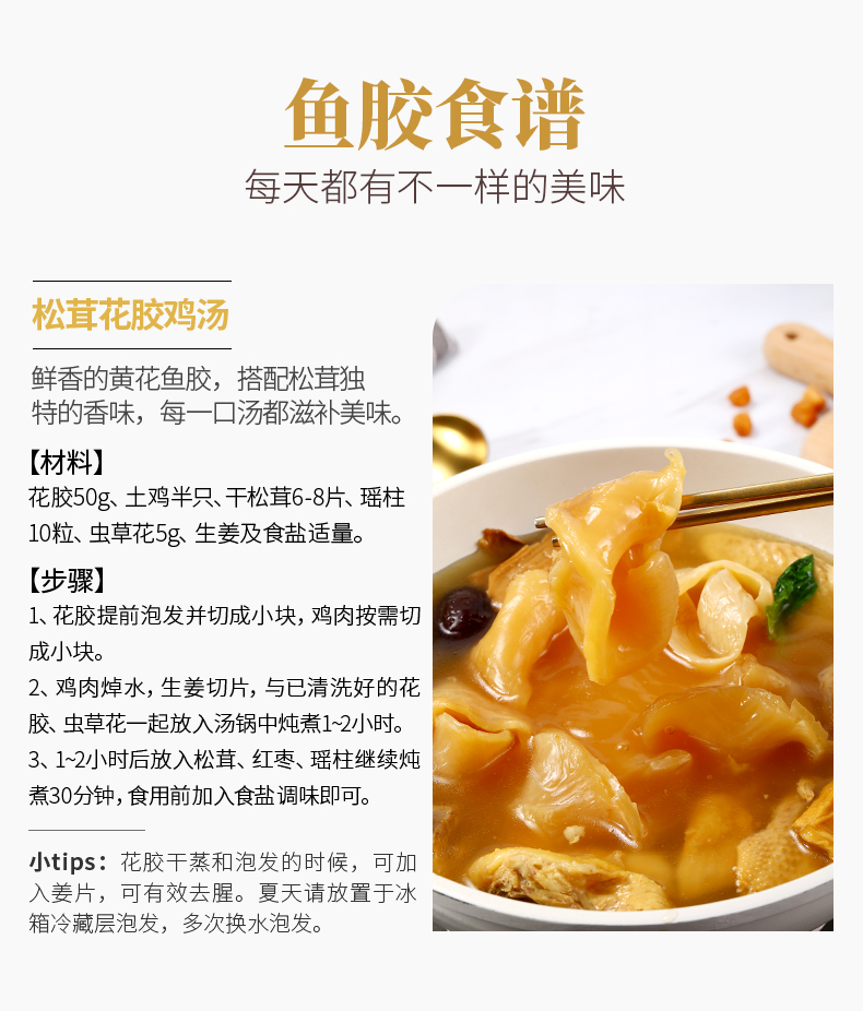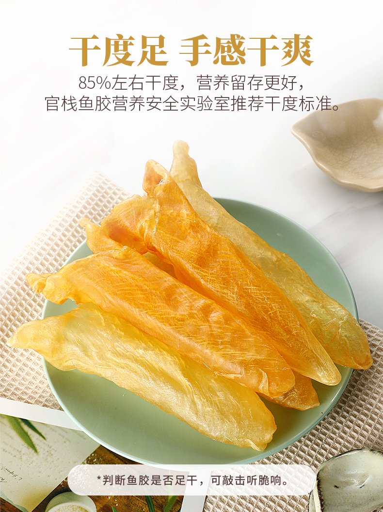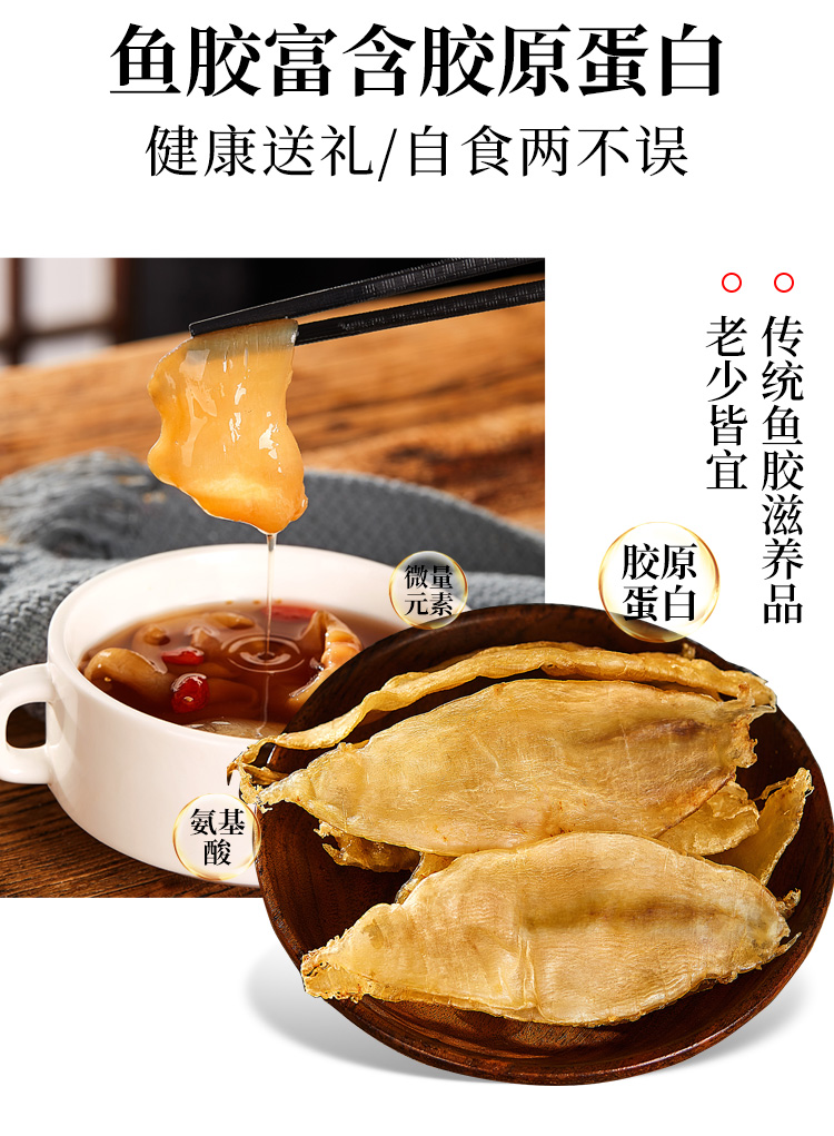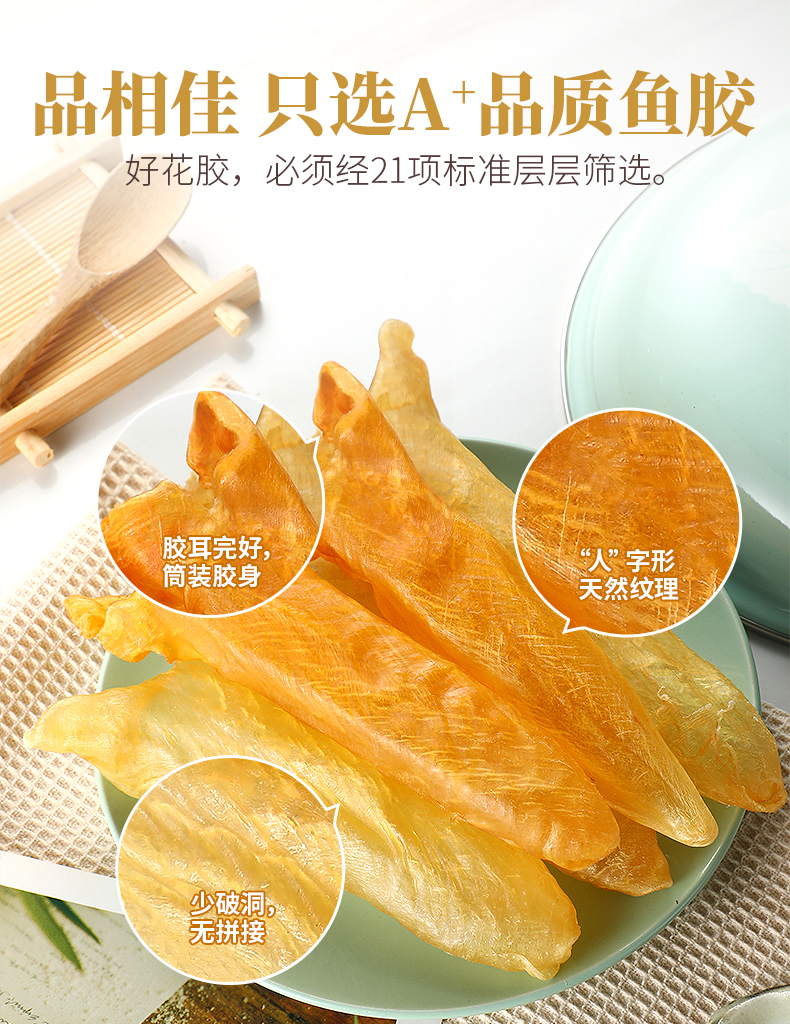 花膠即魚肚,是各類魚鰾的干制品,以富有膠質(zhì)而著名,故名為花膠。花膠又名魚肚,是從魚腹中取出魚鰾,切開曬干后而成?;z含有豐富的蛋白質(zhì)、膠質(zhì)等,食療有滋陰養(yǎng)顏、固腎培精之效,可令人迅速消除疲勞。頂級魚肚排名依次是魚膠之王:金錢鳘魚膠、白花膠、黃鱘膠、黃花膠、鳘魚膠。花膠不僅是筵席名菜,還有相當(dāng)?shù)淖萄a價值。